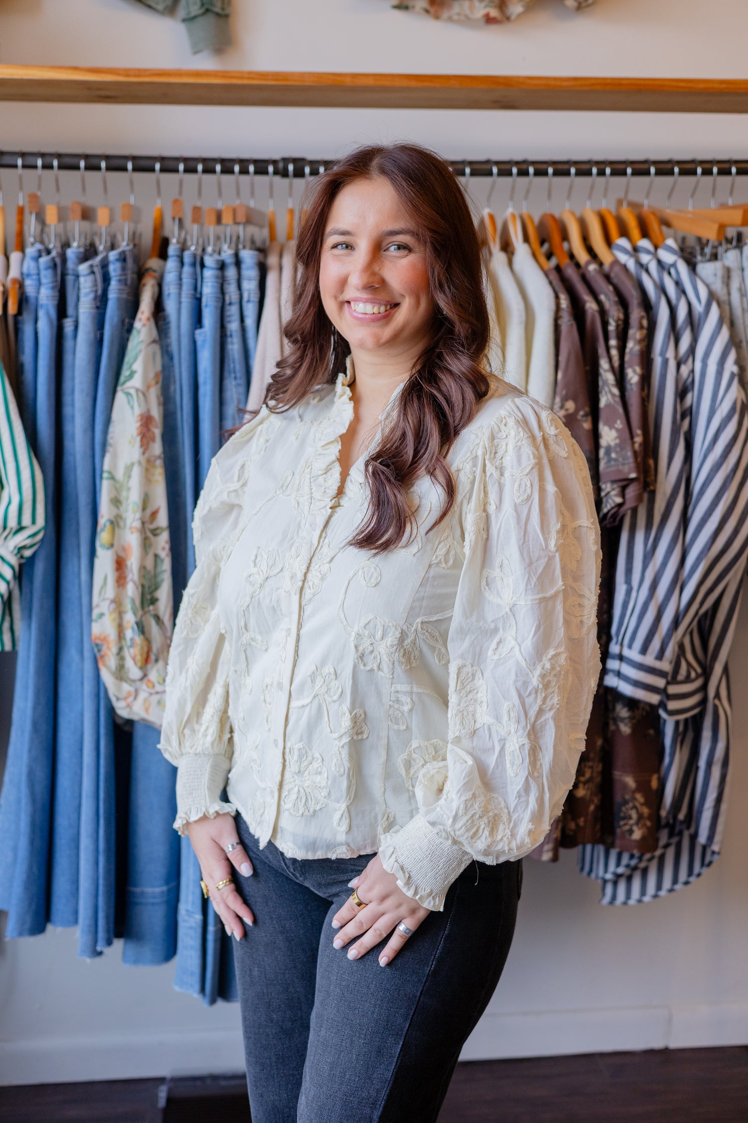 - Floral applique blouse with long puff sleeves, smocked ruffle cuffs, functional buttons & v-neckline