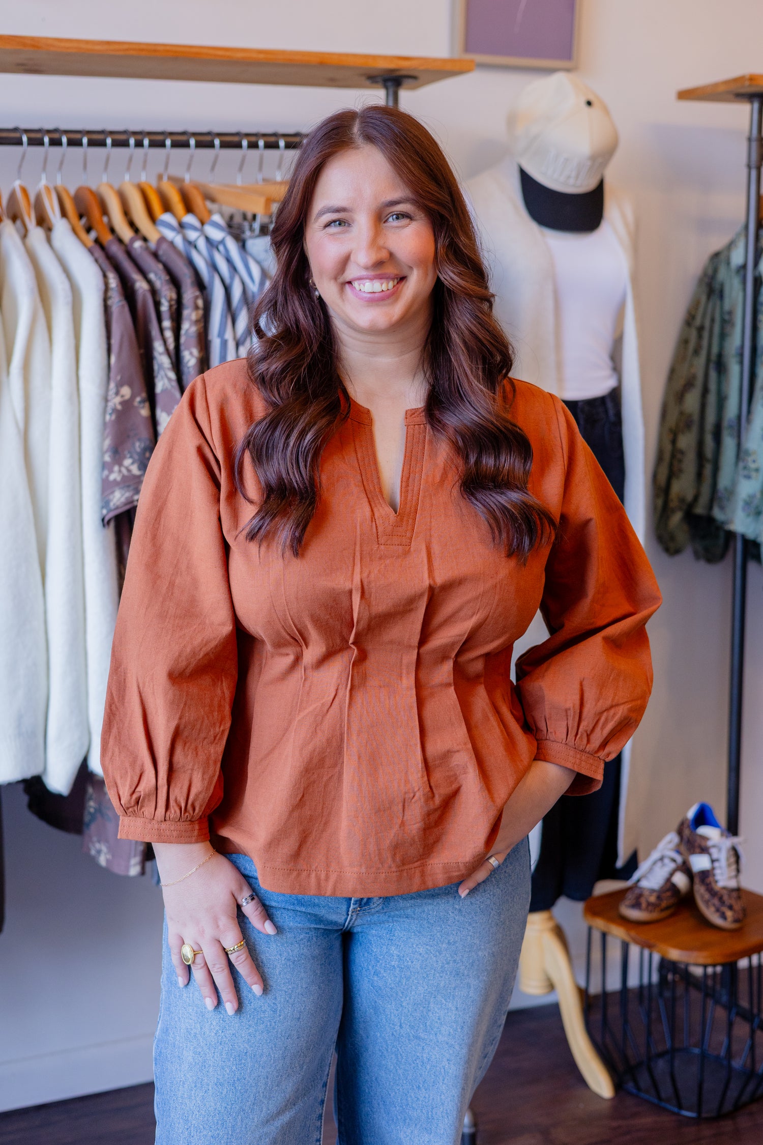 - Solid v-neck long sleeve top with pintuck detail & elastic waist