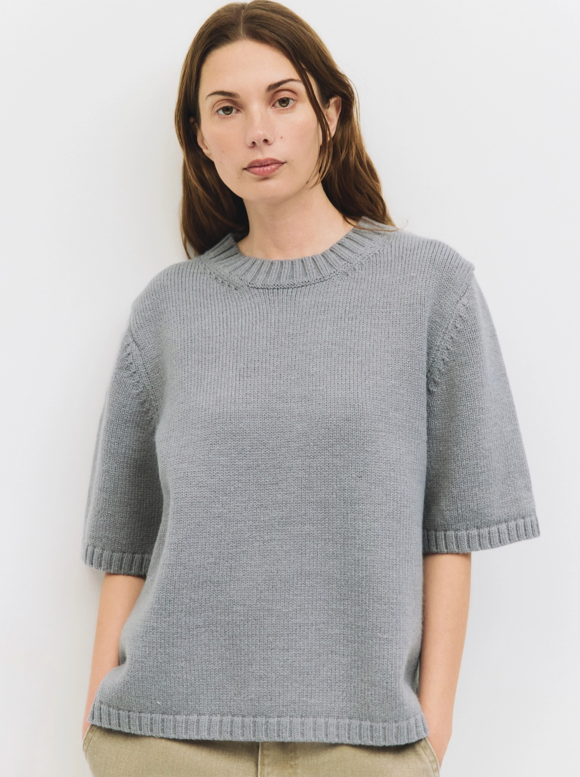 - The Ruben top with boxy fit, short sleeves, crew neckline & side slit accents